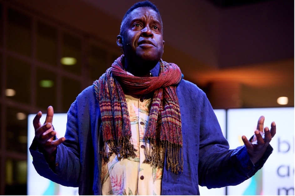 Na een bijzondere ‘proloog’ door Kenneth Kellogg, die in alle producties van ‘Blue’ die er tot nou toe gegeven zijn, de rol van de vader heeft gezongen, een prachtige aria uit ‘Blue’ door de moeder in de Amsterdamse productie, Aundi Marie Moore, en een recht uit het hart en daardoor soms wat ongestructureerd, maar bloed eerlijke verhaal van Péris J. Conrad over zijn vreselijke ervaringen als gediscrimineerde zwarte politieman in Nederland, sprak de schrijver van het libretto en regisseur van ‘Blue’, Tazewell Thompson, over het ontstaan van de opera ‘Blue’.