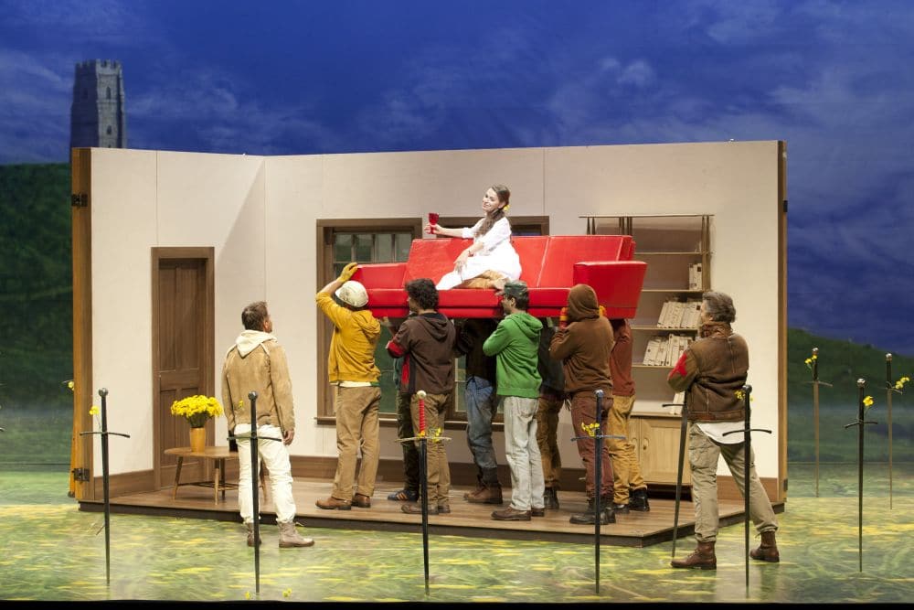 Goed, mij viel die enscenering ook wat tegen. Ik heb niets tegen ‘moderne – mooie – logische’ ensceneringen, maar hier had ik toch wel wat meer ‘Legende van de Ronde Tafel’in gewild. Nu kwamen de hedendaagse kostuums wat gemakkelijk en sfeerloos over. Er zat wel een zekere logica in om de ondergang van de Ronde Tafel voor te stellen als ‘de Val van het Huis Arthus’ om Edgar Allan Poe te parafraseren. Dit gebeurt dan ook letterlijk: in het eerste bedrijf wordt het huis opgetrokken, in het tweede bedrijf staat er een sofa naast (ook al niet erg origineel) en in het laatste bedrijf wordt het huis neergehaald en gaat de sofa in vlammen op. Weg, echtelijk geluk! Het verre beeld van de torenruine op de heuvel is de enige allusie op de middeleeuwen; en de hier ietwat anachronistische zwaarden, die wel eerst dienst doen als een soort omheining, maar dan ook één voor één weggenomen worden (men heeft ze tenslotte nodig om te vechten!).