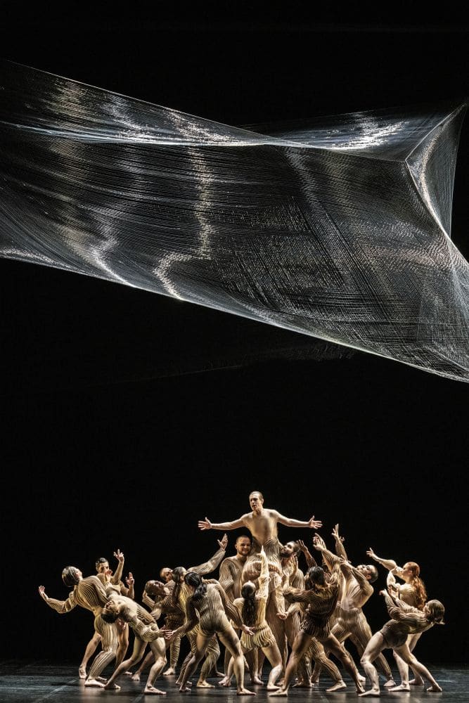 De tien zangers zijn aangevuld met evenzovele dansers van Dance Company Nanine Linning, allen vergelijkbaar gekleed en permanent op het toneel. De groep beweegt zich als een menselijke sculptuur, zonder echte danstechnische hoogstandjes. Hierdoor kunnen de zangers goed meekomen met de dansers. Alleen de solisten treden zo nu en dan uit het geheel.