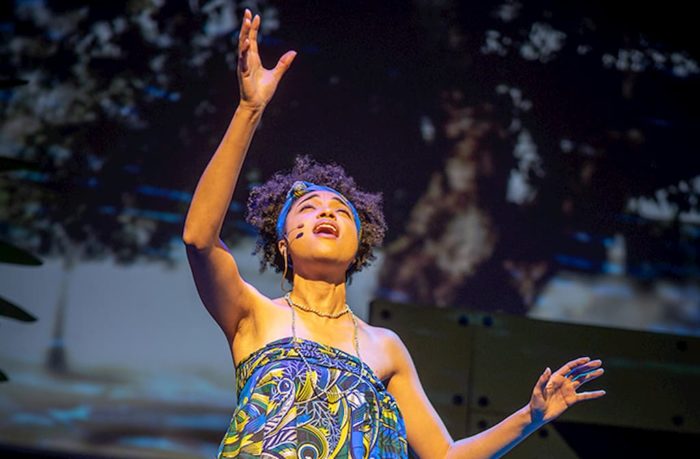 ‘I am Yemandja’ schalde de stem van zangeres/actrice Angelique Kidjo versterkt door de grote zaal van de goed gevulde schouwburg. Kidjo is een statige vrouw die met haar uitstraling op perfecte wijze de rol vervulde van de geest van het water en de vruchtbaarheid. In het stuk is zij een soort goede fee van een jonge vrouw genaamd Omolola. Die krijgt van Yemandja bij haar geboorte de gave van het lied cadeau. Met haar muziek kan zij vrede brengen, maar alleen als haar hart zuiver is.