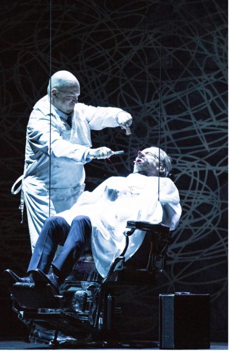 Het bühnebeeld voor de Neus werd gedomineerd door een donkere speelvloer met intrigerende wolken die een driedimensionale weergave leken van potloodkrassen. Soms hingen deze hoog boven in de lucht, soms om alles en iedereen heen. En de kappersstoel bungelde ook in de lucht.